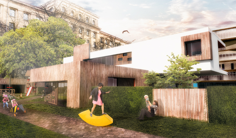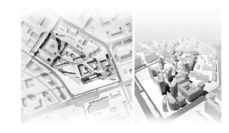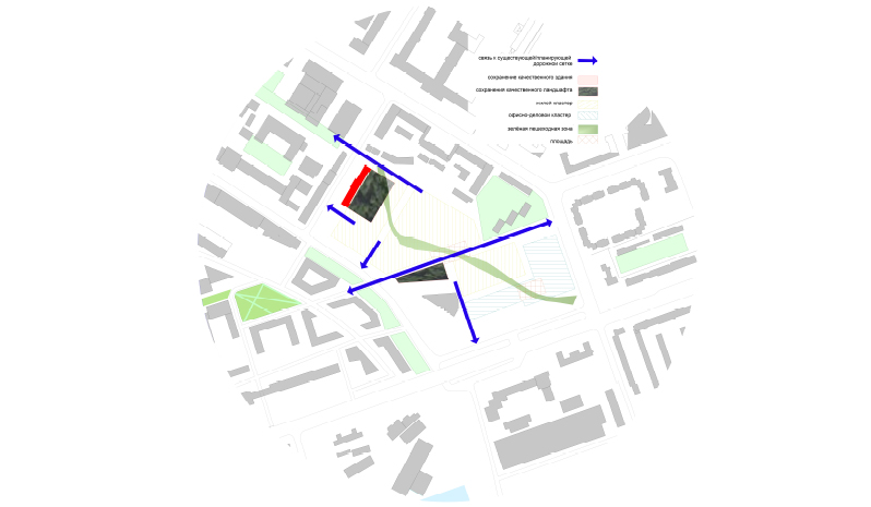 Также в этом концепте сохраняется одно здание (8-6 эт.) с качественным фасадом и уже преобразованным зелёным прострастно во дворе. Таким образом сохраняется история и бывший характер этого места. Это здание, с новым комфортным двором/парком получает особенную роль. Оно становится культурно-досуговый центр новых кварталов. Также сохраняется и второй кусок ландшафтa на юго-западе участка, который превращается в маленький, но уютный парк вoзли центральной «площади».