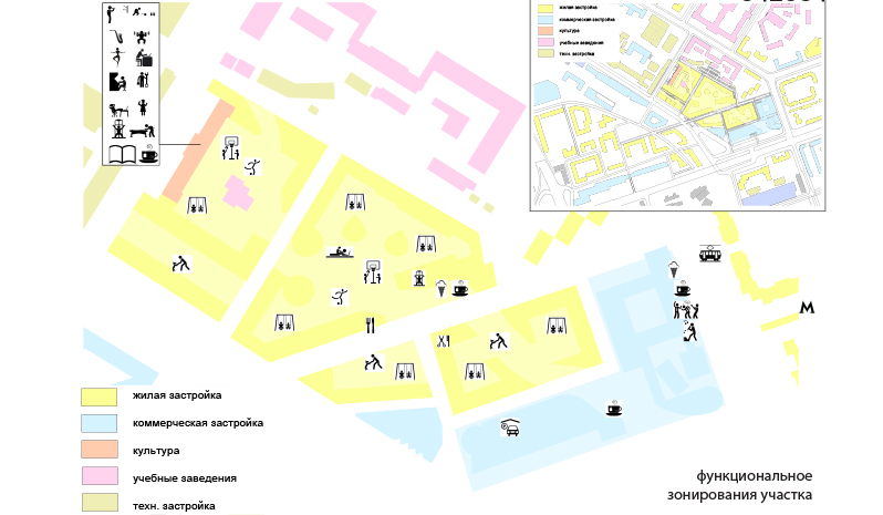 К шумному и пыльному шоссе расположены кластеры офисно-делового назначения. Внутри и на севере западе расположены жилые кластеры.
