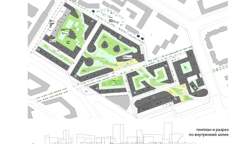 Новое развития на юго-западе, (конкурс Серп и Молот), даёт новую синэнергию, которую подхватывает концепт «живые кварталы». Прямое соединение к главной зелёной оси выигранного проекта Серп и Молотa продолжает новая главная улица в проекте «Живые кварталы».