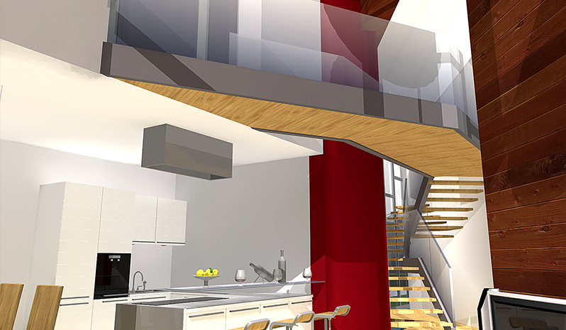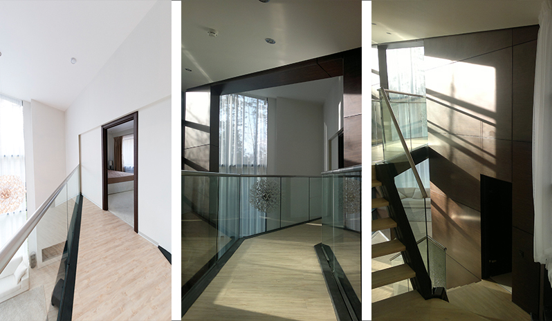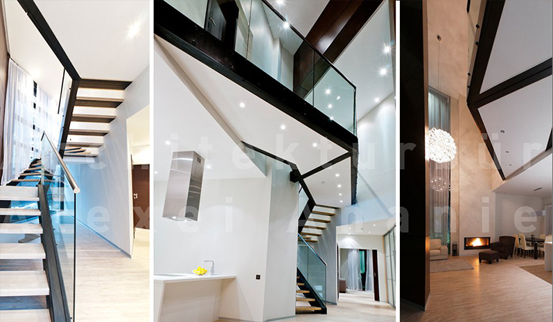 Тропинка, начинающаяся от входа в участок, огибает презентабельный угловой высокий акцент дома, затем попадает в приватное пространство, образующее вход в дом. В интерьере эта тропинка превращается в лестницу, которая спирально поднимается наверх и дальше образует мост, который „пролетает“ сквозь разные пространства, заходя в мастер-спальню. В конце спирали находится санузел мастер-спальни, в котором из ванной открывается отличный вид на лес.