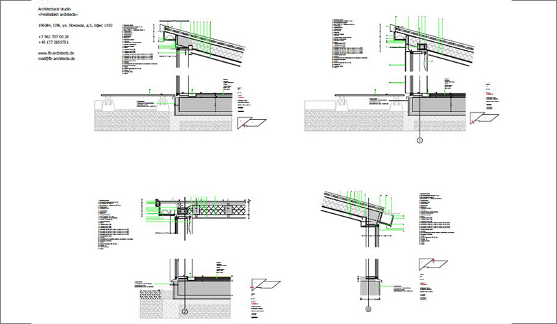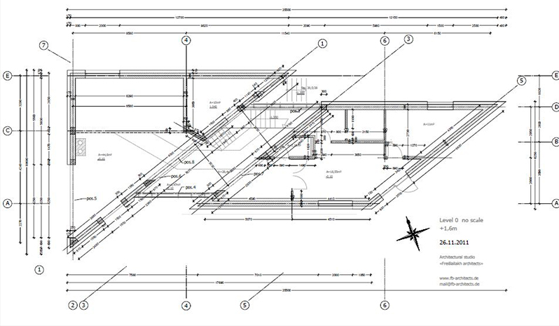 Совместными силами как с стороны планировщика, так и со стороны заказчика, эти сложности могли были быть преодолены. Планировку фундаментной плиты со сложной геометрией выполнила немецкая инженерная компания – фузи ингерниеур. Для всей планировки дома понадобилось более 200 архитектурных и конструктивных чертежей с масштабом до 1:1.