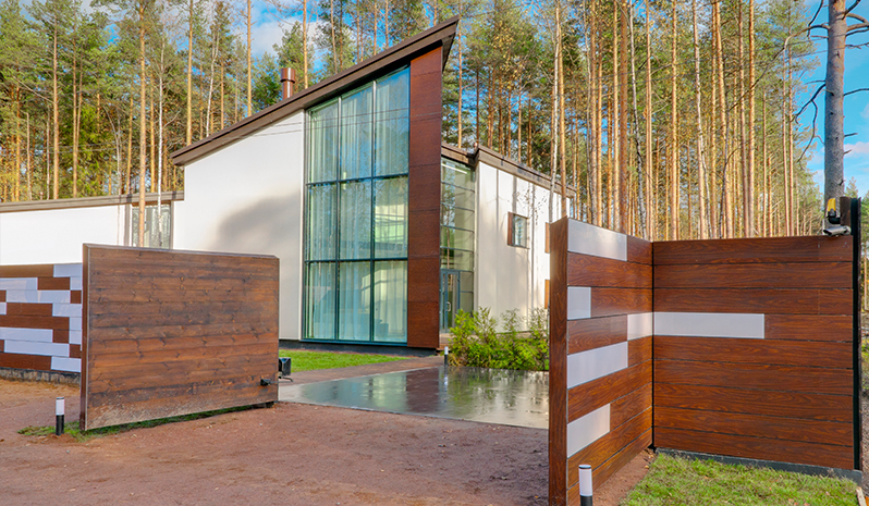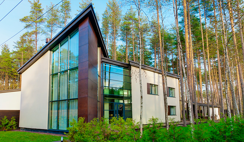 сделать дом удлиненным, горизонтальным, врезающемся в высокий сосновый лес.