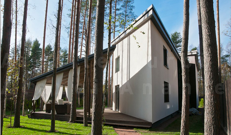 Коттедж состоит из 5-ти спален, 2 санузлов, сауны и гостиной, соединённой со столовой и кухней. Со стороны леса находится веранда с навесом.