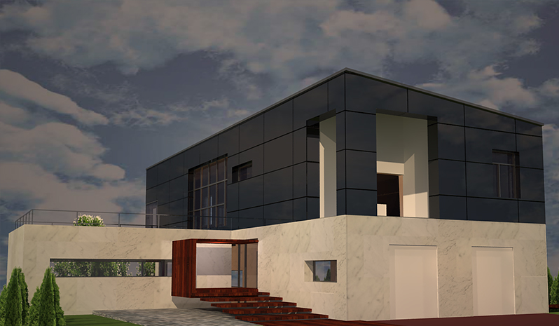 Оригинально был решен фасад дома: с помощью тёмных зеркальных фасадных панелей, отражающих окружающую природу, второй этаж виллы как бы дематериализовывается.