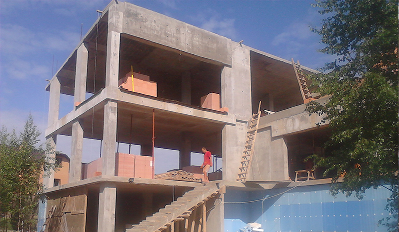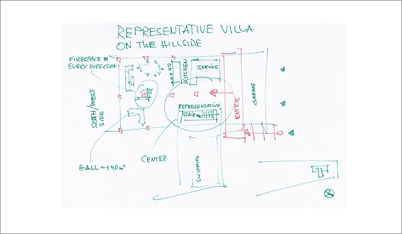 Первое знакомство с проектом произошло, к сожалению, после его частичной реализации. Железобетонный столбечный каркас виллы уже стоял на склоне, когда наша мастерская получила заказ на реконструкцию 850м² пространства. Красивый ландшафтный вид участка, ориентированного на юг, предоставлял большой потенциал для реализации атрактивного индивидуального жилья за городом.
