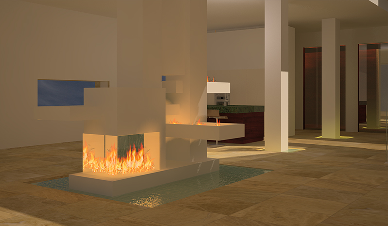 Внутри доминирует свободное пространство гостиной с центральным элементом-скульптурным камином, включающим в себя так же водопад.